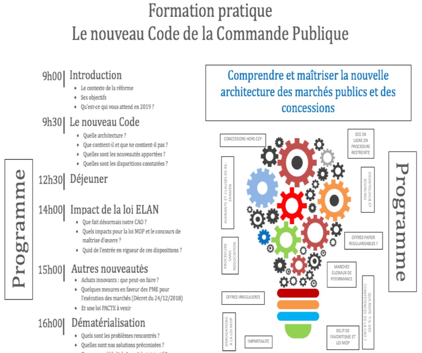 Ce séminaire est destiné à tous les acheteurs, Maîtres d'oeuvre et entreprises, avec pour objectif de comprendre, analyser et maîtriser le code de la commande publique, de connaitre les principales nouveautés 2019 (Loi ELAN, décret "Innovation", future loi PACTE, et de partager les premiers retours de la "Full Démat".